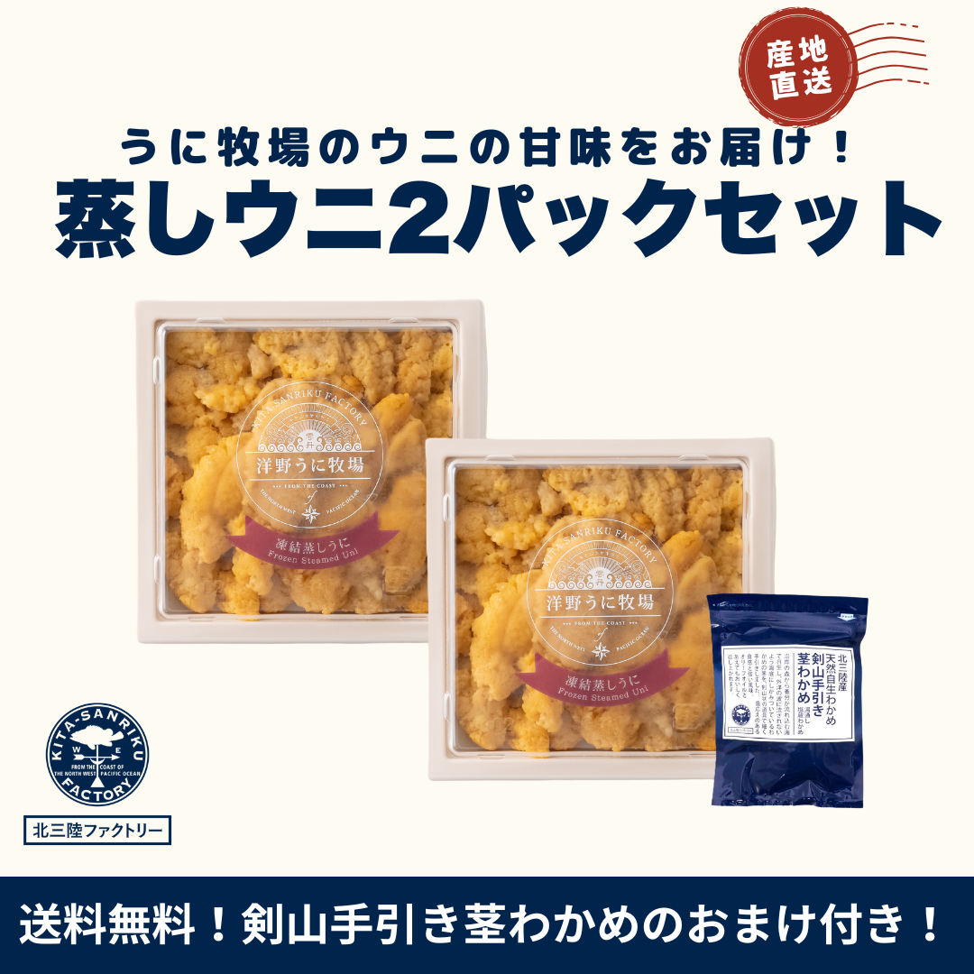 【感謝の特別セット】「洋野うに牧場の四年うに®」濃厚蒸しうに100g(木枠入り)2パックセット / 剣山わかめのおまけ付き